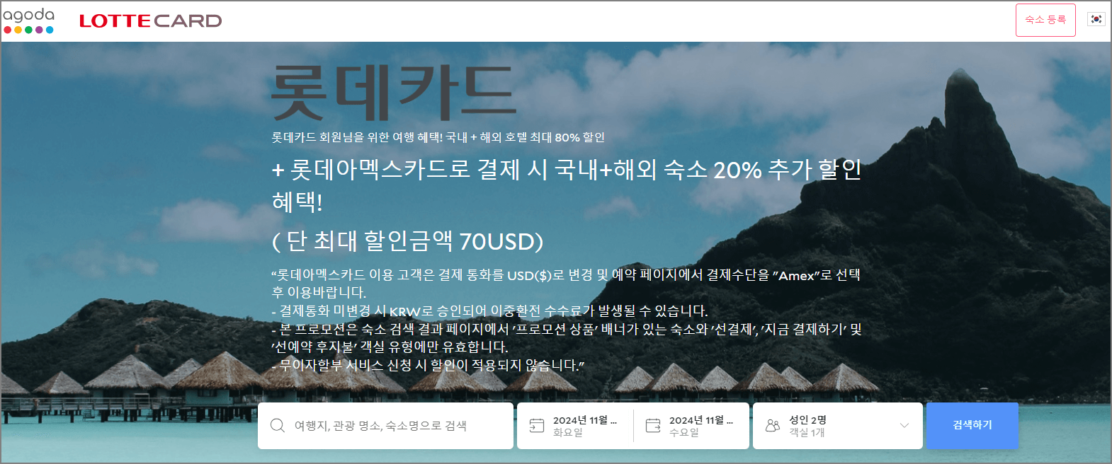 아래 롯데카드 전용 페이지에서 롯데 아멕스 카드로 국내, 해외 숙소를 선결제하면, 20% 할인을 받을 수 있습니다.